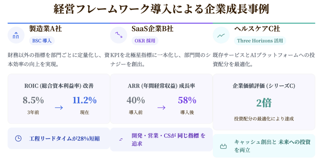 経営戦略フレームワークは目的と時間軸の組み合わせで整理すると選定が容易です。短期の成果創出にフォーカスする「OKR」は四半期単位でストレッチゴールを設定し、組織にスピード感をもたらします。中期のバランスを重視する「BSC(バランス・スコアカード)」は財務・顧客・内部プロセス・学習成長の4視点から戦略を可視化し、部門間の整合性を高めるものです。長期の事業ポートフォリオを描く「Three Horizons」は既存事業、成長事業、未来事業を階層管理し、イノベーション投資のタイミングを明確にします。さらに、日本企業で浸透する「方針管理」はトップダウンとボトムアップを往復させながら年度計画をブレークダウンし、現場の納得感を担保する仕組みです。