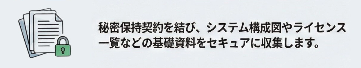 これらの資料は、対象企業のIT環境の全体像を把握し、潜在的なリスクや課題を特定するための基礎情報です。