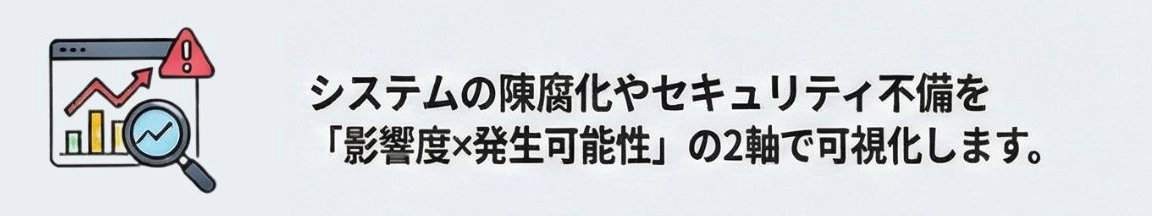 | システムの陳腐化・ブラックボックス化 | 古い技術や特定の担当者しか理解できないシステムは、将来の運用コスト増大や障害発生時の対応遅延につながる可能性があります。 |