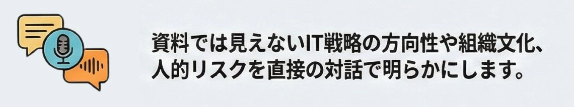 一方、マネジメントインタビューは、対象企業の経営層やIT部門の責任者、キーパーソンに対して直接ヒアリングを行う重要な機会です。このインタビューの目的は、資料だけでは見えてこない定性的な情報を把握することにあり、具体的には以下の点が挙げられます。