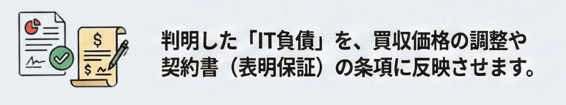 たとえば、ソフトウェアライセンスのコンプライアンス違反や脆弱なセキュリティ体制といった「隠れたIT負債」は、株式譲渡契約(SPA: Share Purchase Agreement)における「表明保証」の条項に反映させることで、買収後に問題が顕在化した場合の責任の所在を明確にできます。また、想定外の追加投資が必要となるようなIT負債は、買収価格の調整交渉の根拠となることもあります。